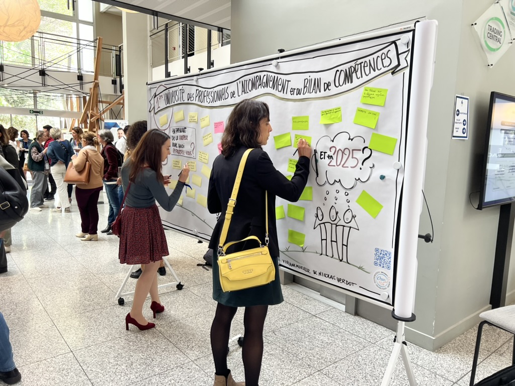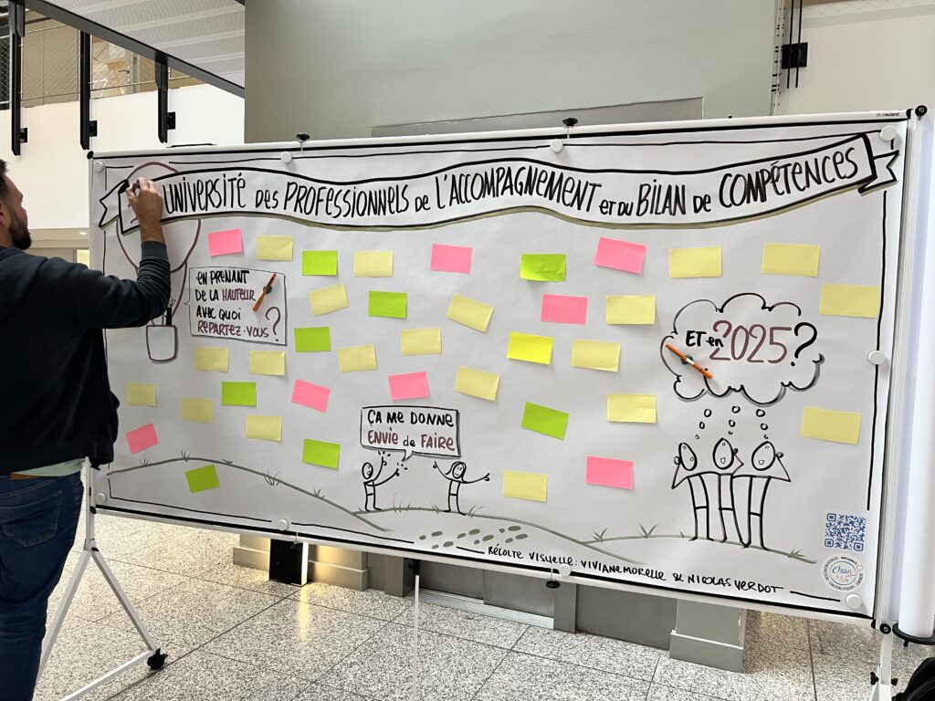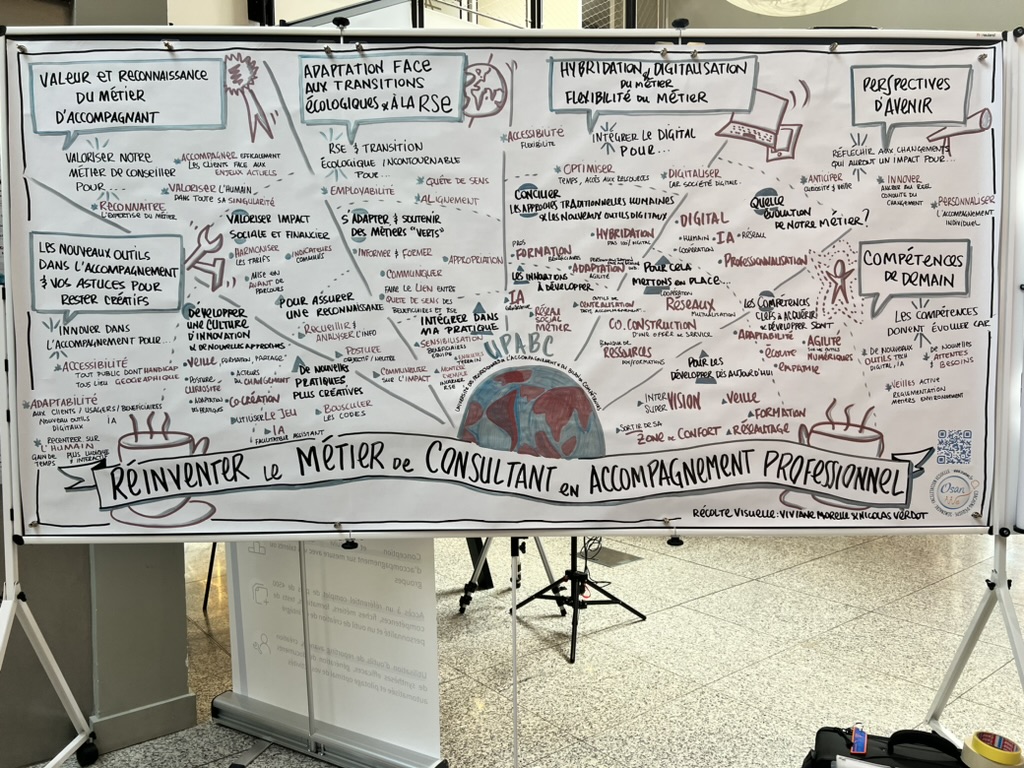 Nous avons accompagné visuellement cette première rencontre en réalisant la fresque de restitution des travaux en sous groupes lors des world café sur le thème de « Réinventer le métier de consultant en accompagnement professionnel ».